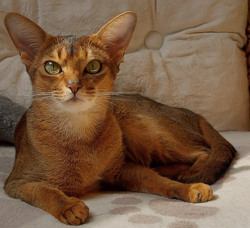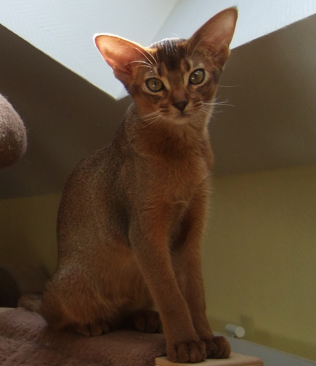 Miramis ist in ihrem Charakter ganz sanft, dabei sehr anhänglich und möchte es allen gerne recht machen. Dennoch ist Mira, wie sie hier gerufen wird, durch ihre so offene, unerschrockene und zugleich verschmuste Art bei allen Pfoten beliebt, auch wenn mancher doch lieber seine Ruhe vor dem Wirbelwind hätte. In Luana hat Mira sofort eine neue Ziehmama gefunden und von Youngster Merlin wird sie regelrecht angehimmelt. Mira ist bereits in ihrem jungen Alter von 6 Monaten eine sehr typvolle, grazile Abessinier auf hohen eleganten Beinen, die schon besonders früh ein ausgeprägtes Ticking entwickelt hat. Ihre weichen Konturen mit einem kräftigen Kinn erwecken den putzigen Anschein, als lächele sie unentwegt. Wir sind wirklich sehr gespannt auf Mira´s Entwicklung und unseren gemeinsamen Weg.